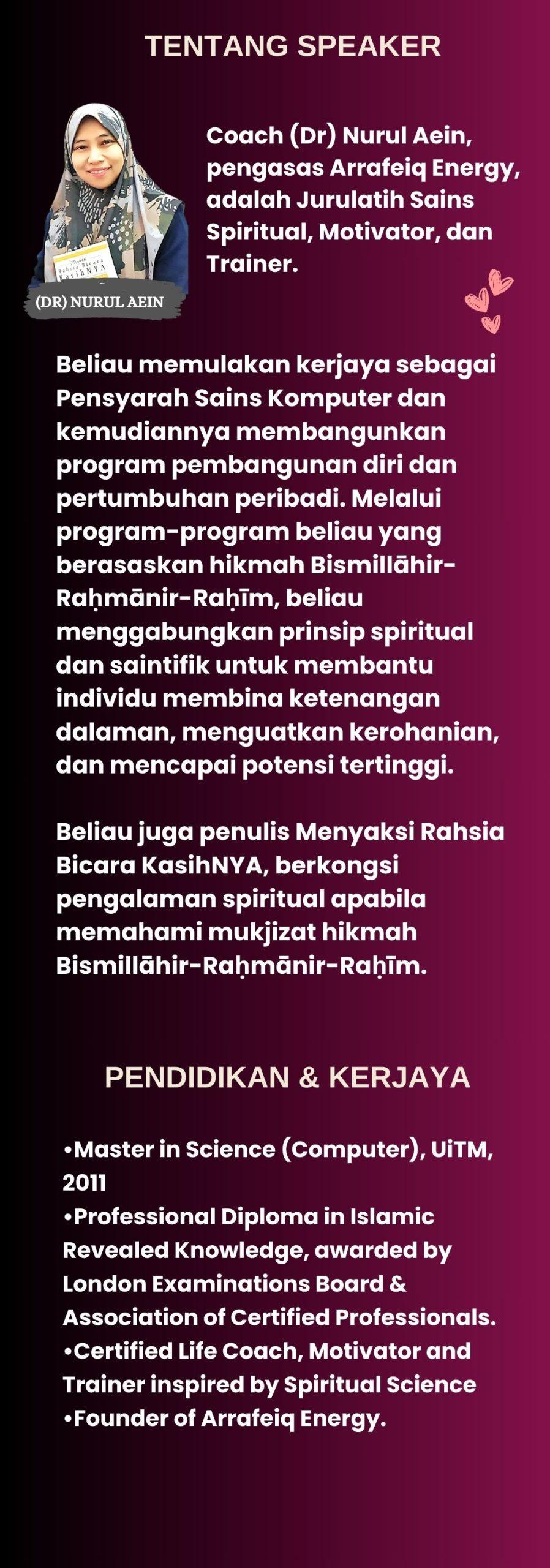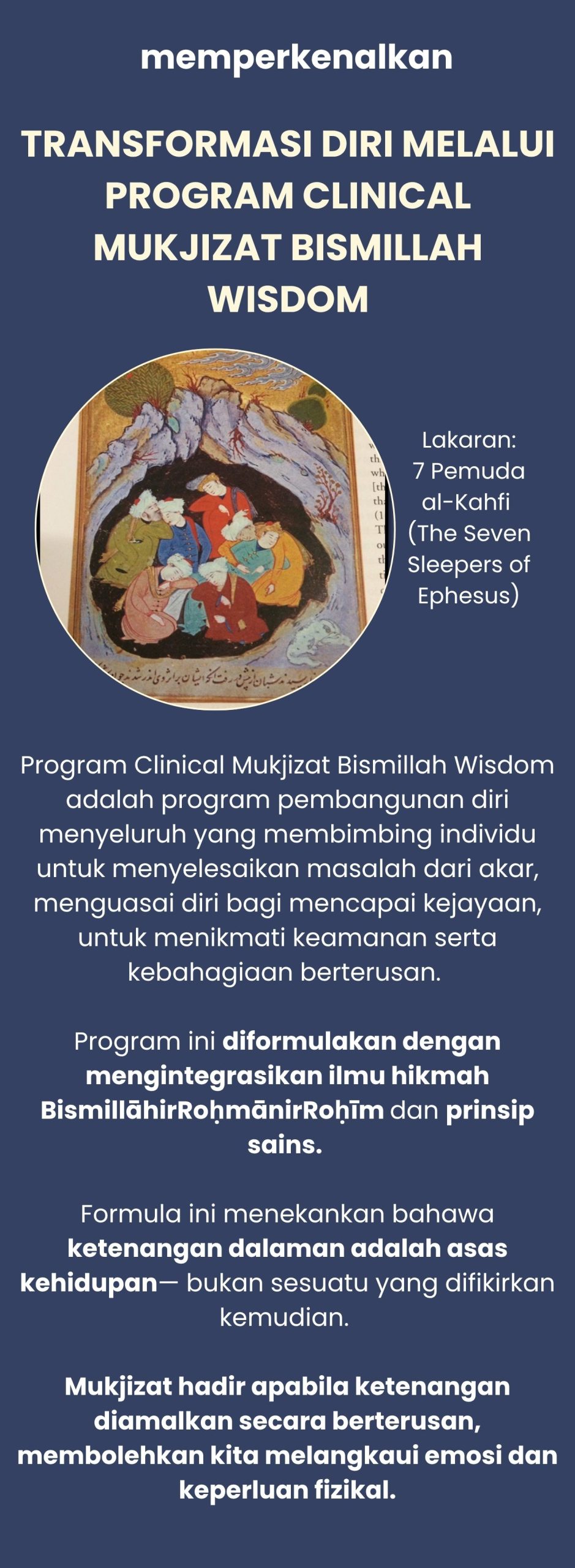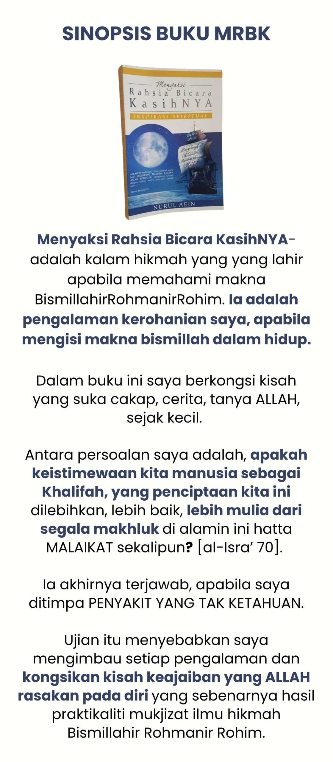 Perkongsian daalm buku dan kelas ini adalah berdasarkan pengalaman peribadi penulis/penceramah dalam menjalani proses self-healing serta penghayatan spiritual melalui mukjizat ilmu hikmah Bismillahirrahmanirrahim. Ia bertujuan memberi inspirasi kesedaran tentang kuasa sembuh semulajadi Insan, sekaligus menggilap potensi Diri dengan mengubah subconscious mind supaya menjadikan Aman Bahagia sebagai asas, akar dalam kehidupan, tanpa dikuasai atau dikawal oleh keadaan.