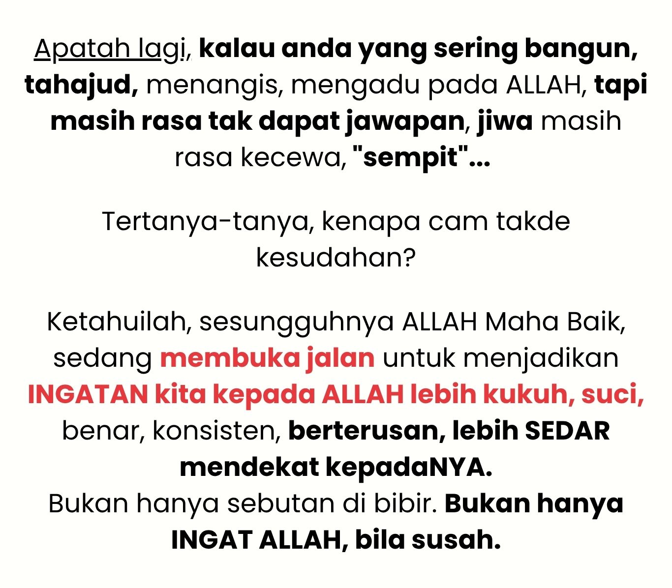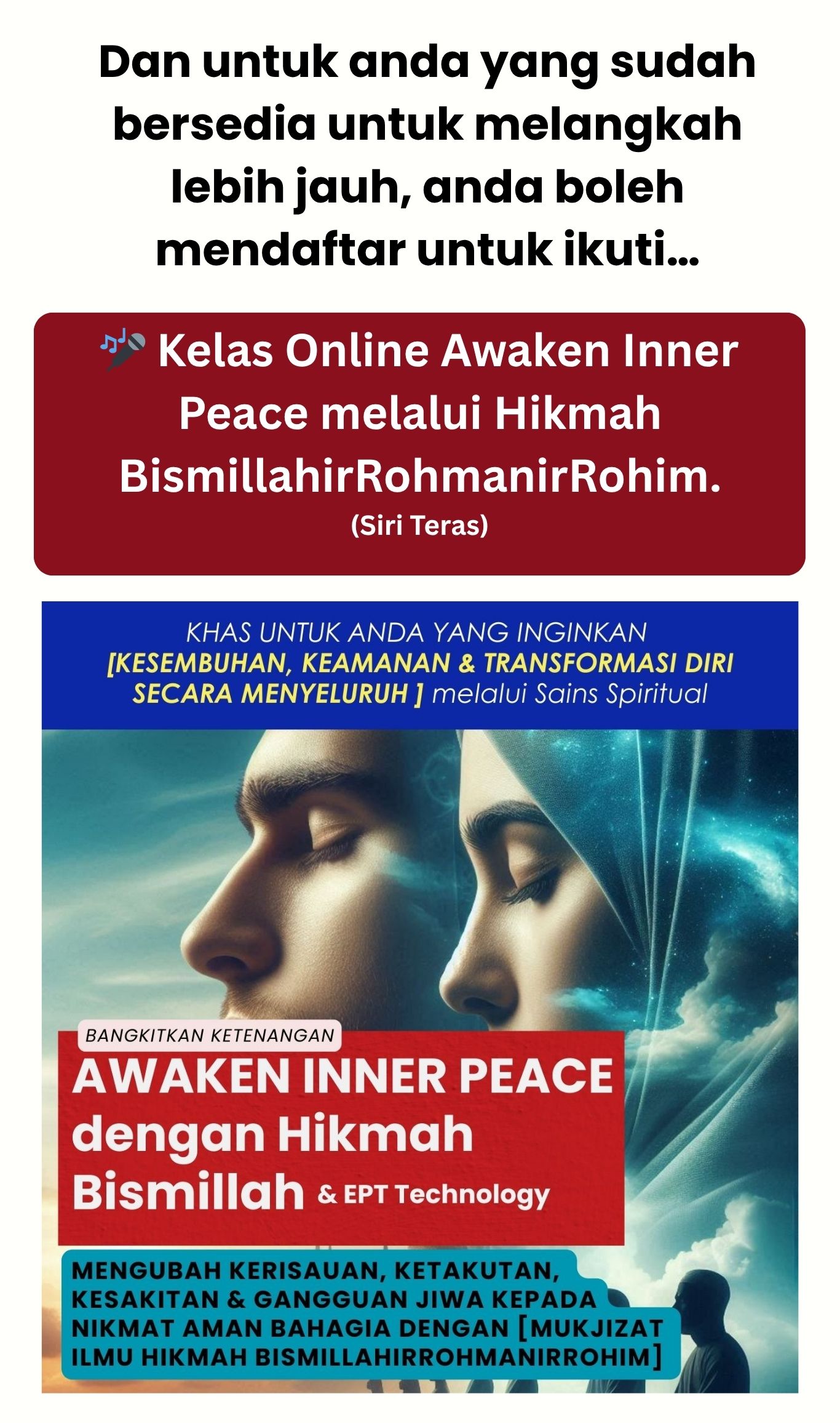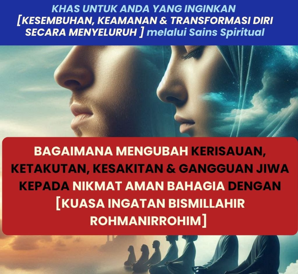 Bismillahhir Rohmanir Rohim, “Saudara Saudariku, Perlu faham, semasa mencari penyelesaian, kesembuhan (sebenarnya) kita sedang mencari ENERGI yang match, yang ALLAH mahu kita tahu, SEDAR sesuatu, “mesej” teguran kasih sayang dariNYA. Ada ramai peserta saya, yang mengakui mereka mula sembuh setelah TERSEDAR mendengar kata-kata yang dilontarkan dalam kelas seminar dan ada yang ketika membaca buku MRBK.