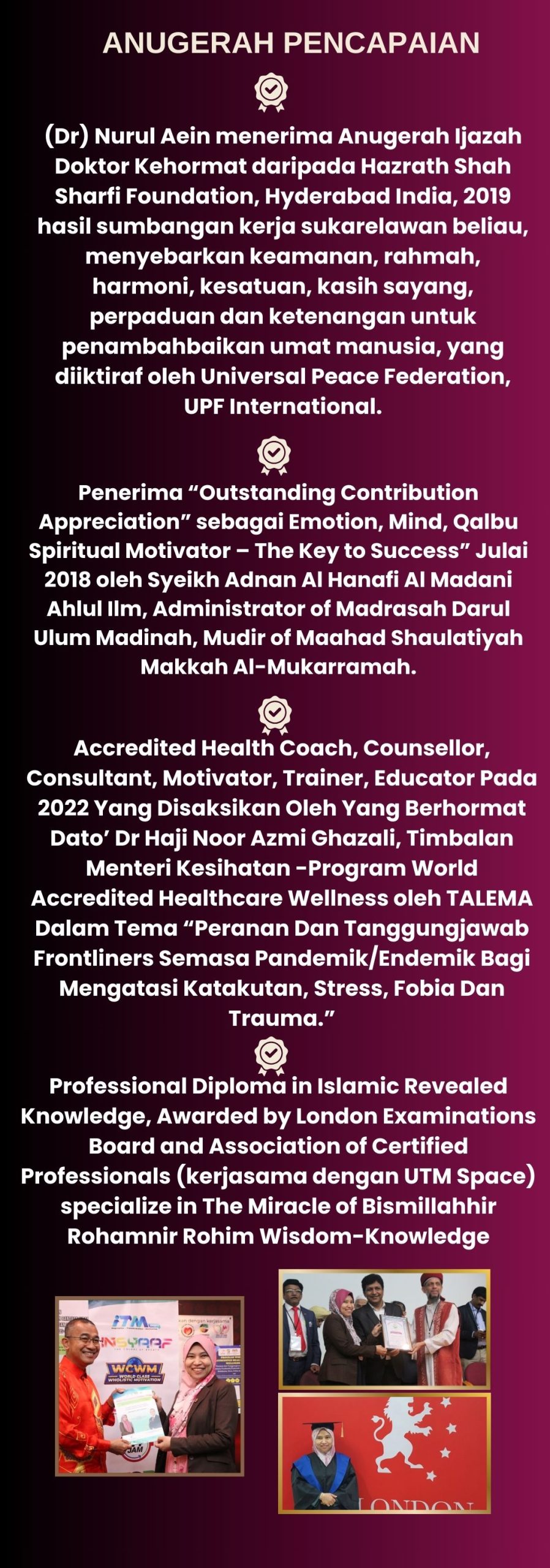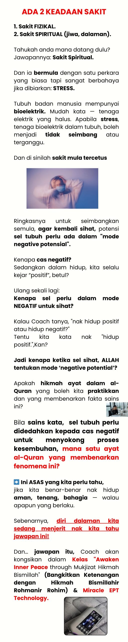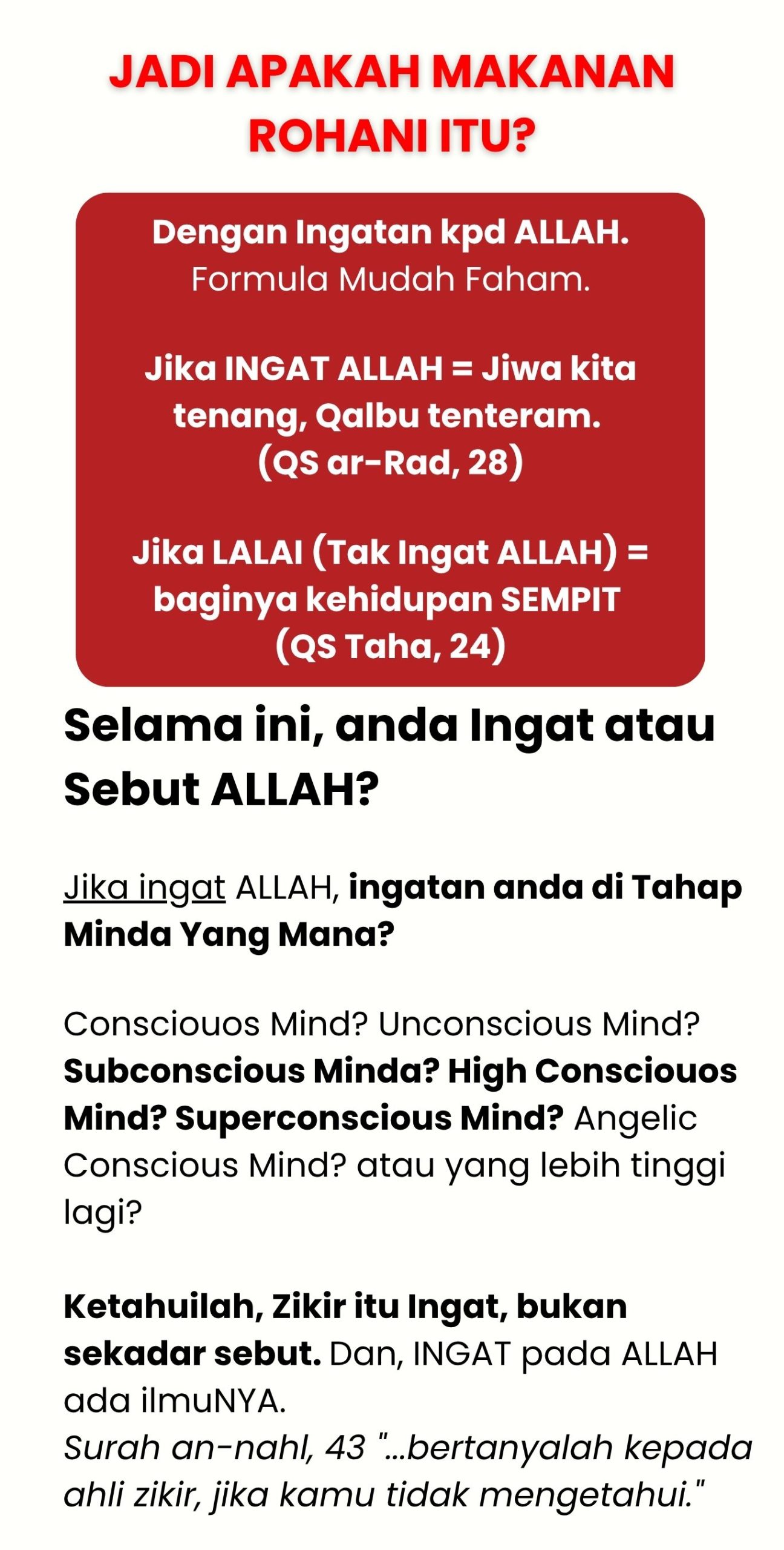 Bismillahhir Rohmanir Rohim, “Saudara Saudariku, Perlu faham, semasa mencari penyelesaian, kesembuhan (sebenarnya) kita sedang mencari ENERGI yang match, yang ALLAH mahu kita tahu, SEDAR sesuatu, “mesej” teguran kasih sayang dariNYA. Ada ramai peserta saya, yang mengakui mereka mula sembuh setelah TERSEDAR mendengar kata-kata yang dilontarkan dalam kelas seminar dan ada yang ketika membaca buku MRBK.
