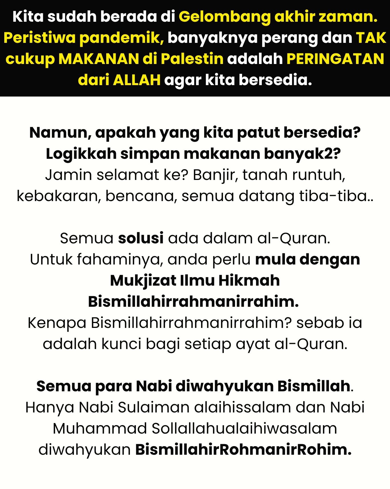 Teringat pesan Awliya ALLAH, Guru Kami, semasa kami menerima amanah untuk sampaikan mukjizat ilmu hikmah BismillahirRohmanirRohim ini, “Apa yang kamu nak sampaikan sebenarnya adalah ‘darah daging’ kamu.” Jadi mereka yang mahu kesan ilmu itu melekat, wajib hargai, perlu bayar dengan ‘energi’, tenaga, dari titik peluh (yang zaman sekarang ada dalam wang ringgit). Kalau dengar secara Percuma, buang masa, takkan ada kesan, takkan melekat (mendalam berpanjangan), masa dengar seronok, bila selesai takkan bawa apa-apa perubahan. (ALLAH mahu pengorbanan)”
