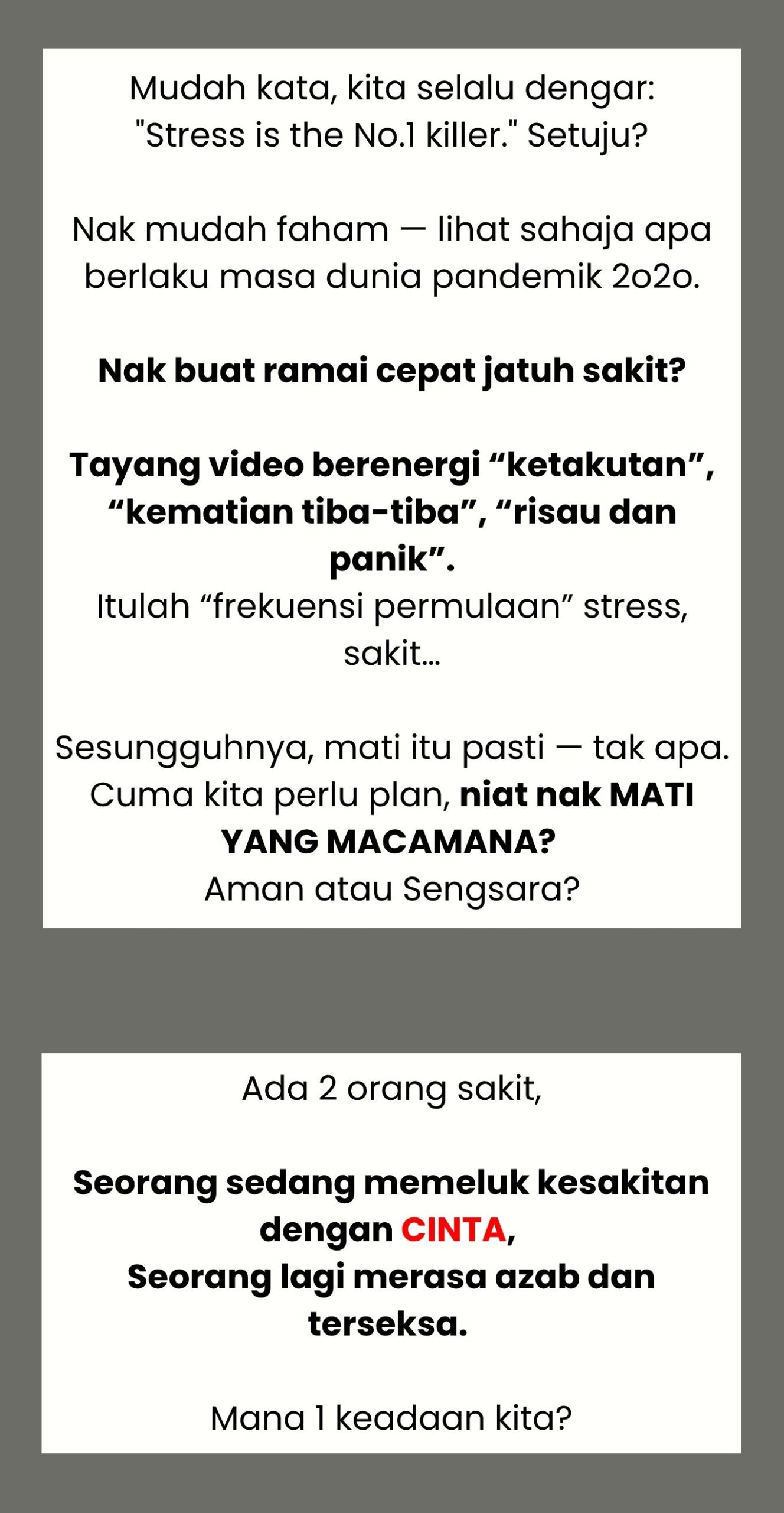 Seumpama bila kita sakit, kita bayar untuk jumpa Doktor, niat nak sembuh, seumpama kita nak maintain kesihatan kita bayar untuk beli supplement, niat nak dapat nutrisi. At the end, bila kita faham secara saintifik segala makanan, ubatan, kita makan, semuanya diproses bertukar kepada ENERGI. – “Apa sahaja yang wujud, setiap zarahnya mengandungi tenaga (inspired by Einstein’s E=mc²)